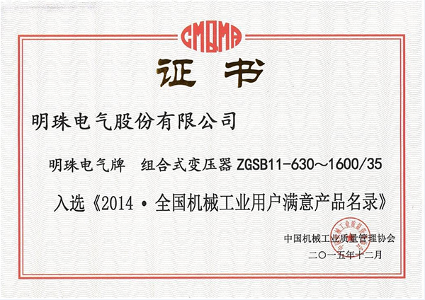 明珠電氣牌組合式變壓器產品獲評"全國機械工業用戶滿意產品"